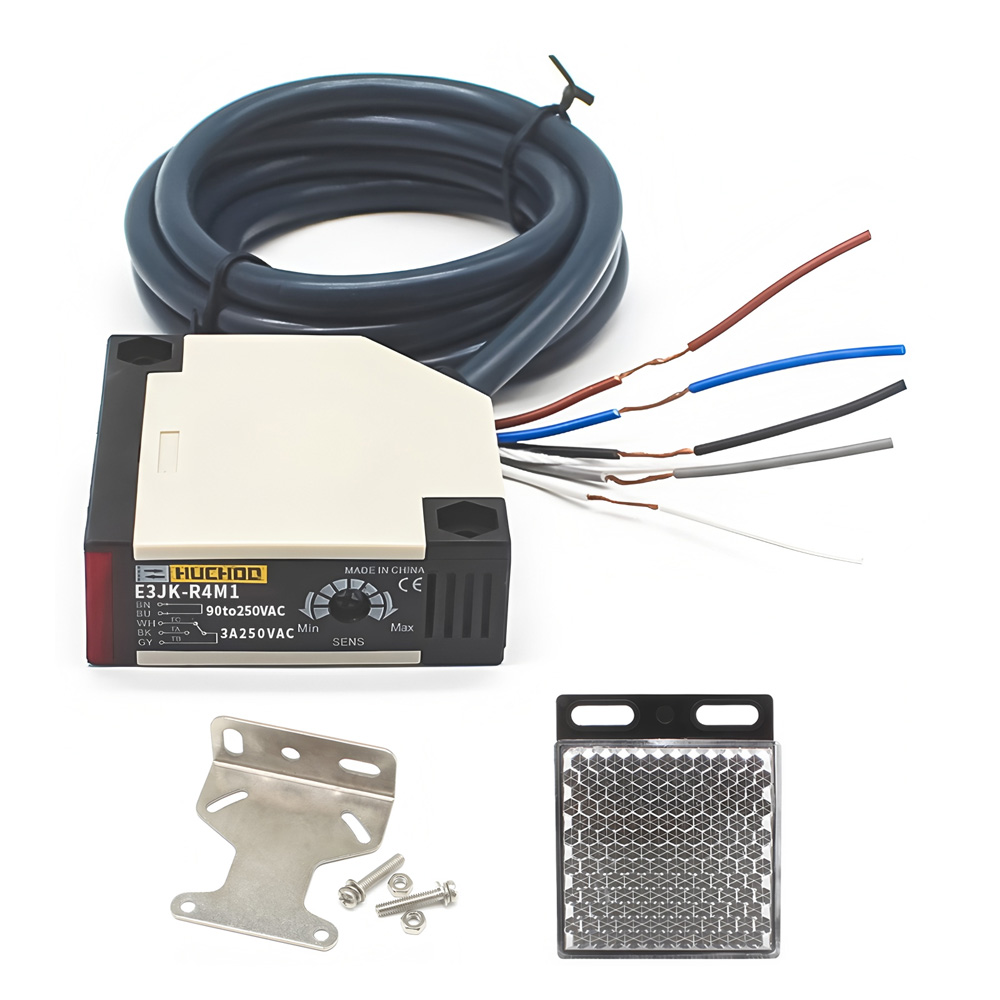 E3JK-R4M1 Retro-reflective Photoelectric Proximity Sensor, AC90-250V, 4M Detection Range, NO+NC, 1.3M Lead Cable