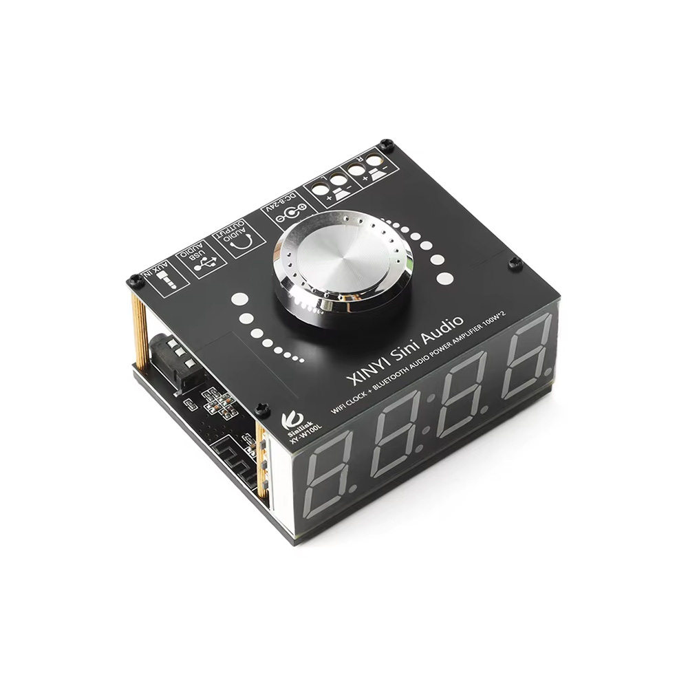 XY-W100L DC8-24V 2*100W Dual Channel 360° Stepless Tone Adjustment Bluetooth 5.0 Audio Power Amplifier Board with WIFI Time Synchronization Clock, Green Font Color